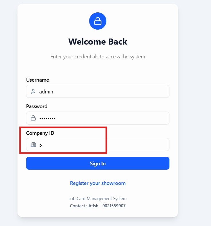 [!IMPORTANT] Company ID (Auto-assigned) β When you register, the system automatically assigns a unique Company ID to your showroom (e.g., #5). This number is shown at the top of the registration form. You MUST note this number and share it with ALL your staff. Every single user β receptionists, technicians, gate staff β needs this Company ID to log in. Without it, nobody can access the system.