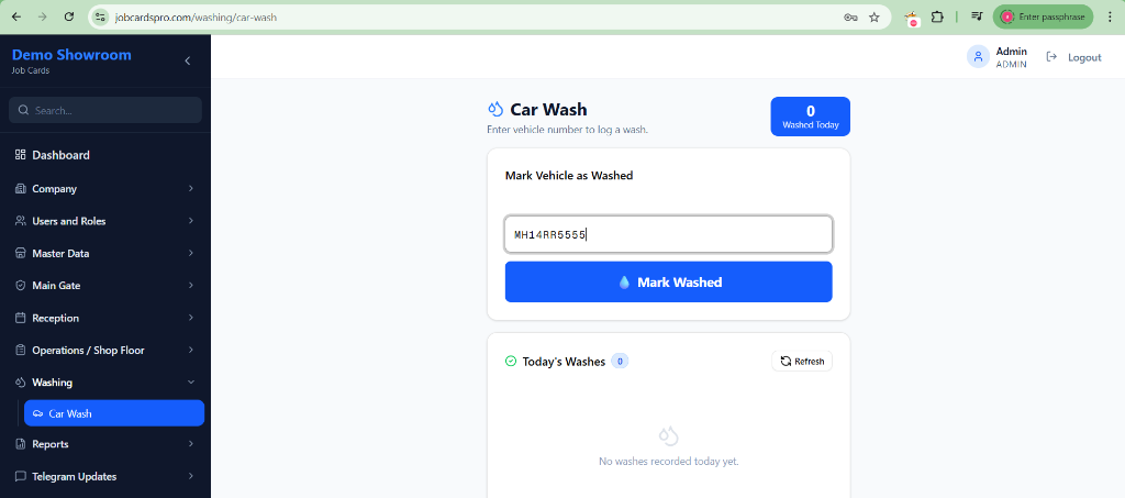 Master Data/Reception/Operations / Shop FloorWashing Queue / Car Wash/Reports/Main Gate EntryCompany Settings/Superadmin Role (Full Access)