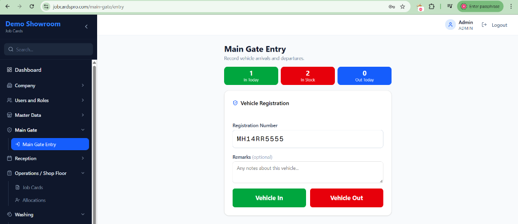 Tracks vehicle entry and exit at the showroom gate β separate from service job cards.