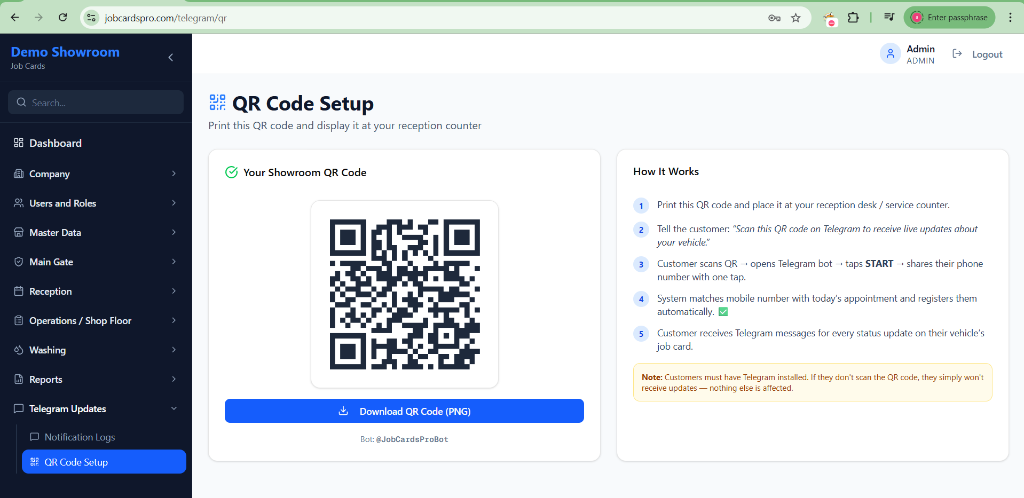 [!NOTE] Customers must have Telegram installed. If they donβt scan the QR code, they simply wonβt receive updates β nothing else is affected. The bot is