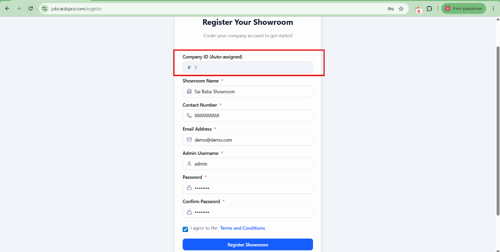 [!IMPORTANT] Company ID (Auto-assigned) β When you register, the system automatically assigns a unique Company ID to your showroom (e.g., #5). This number is shown at the top of the registration form. You MUST note this number and share it with ALL your staff. Every single user β receptionists, technicians, gate staff β needs this Company ID to log in. Without it, nobody can access the system.