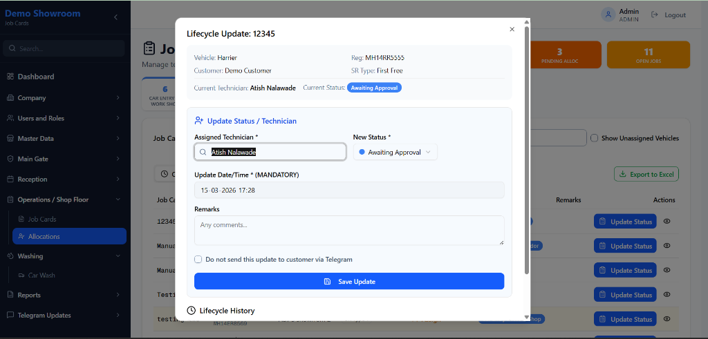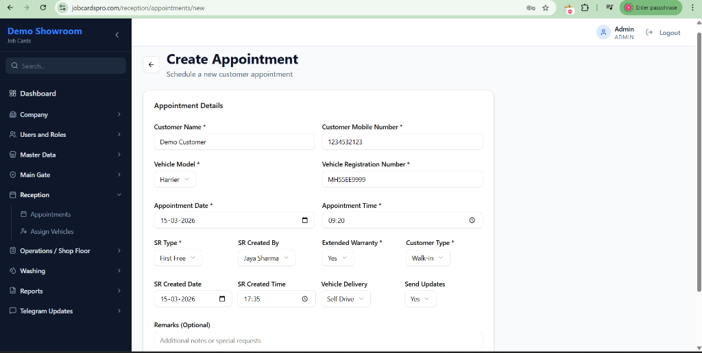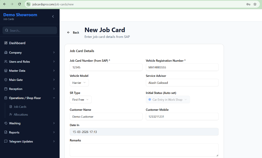 JobCardsPro is a cloud-based workshop management system that helps automobile showrooms manage the entire lifecycle of a vehicle's service visit β from the moment the car enters the gate to the moment it's delivered back to the customer.