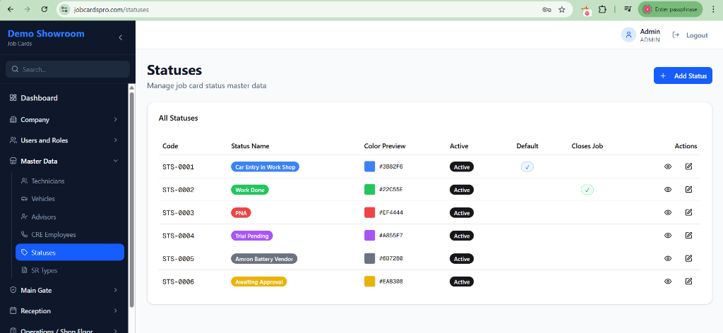 π‘ Tip: Set up Master Data fully before creating your first job card. Each status gets a unique colour, a code (STS-0001 etc.), and flags like Default and Closes Job.
