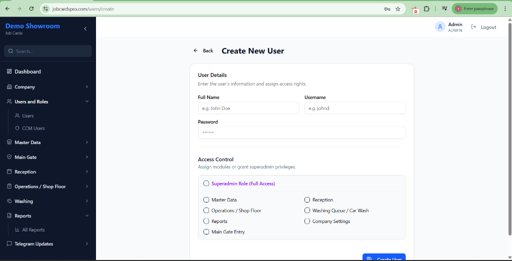 Master Data/Reception/Operations / Shop FloorWashing Queue / Car Wash/Reports/Main Gate EntryCompany Settings/Superadmin Role (Full Access)