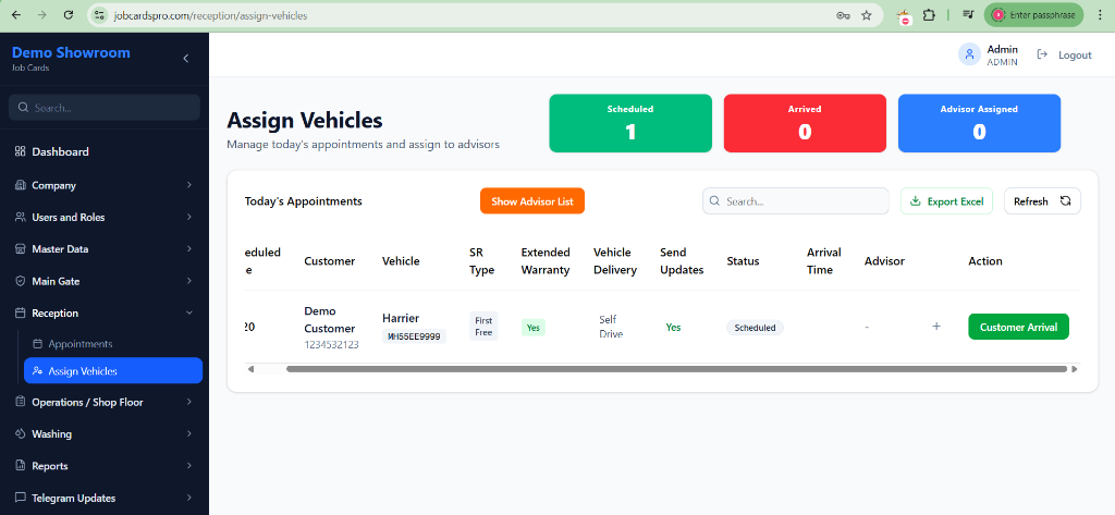 Step 1: Mark Arrival When the customer drives in, find their appointment and click Customer Arrival. The status changes to Arrived and records the exact time.