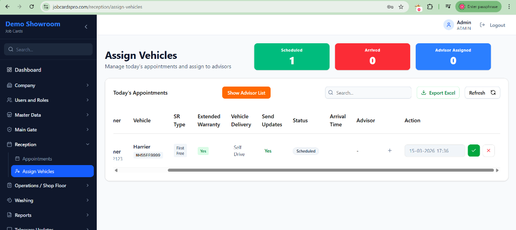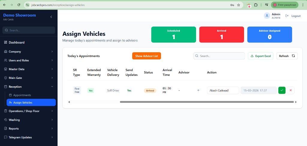 Step 3: Select the Advisor A dropdown appears. Select the available Service Advisor (e.g., Akash) and click the green checkmark β to confirm. The advisor is now officially assigned and the top stat card updates to show "Advisor Assigned: 1".